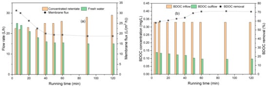 To investigate the effect of influent concentration on BDOC removal, the concentrated water returned back to the tank, and the influent concentration of BDOC increased with the operating time. Room temperature was controlled at 25–30 °C, and the UF process was operated with a constant pressure of 0.25 MPa for 60 min. The impact of the influent concentration on the UF process and BDOC removal is shown in Figure 7.