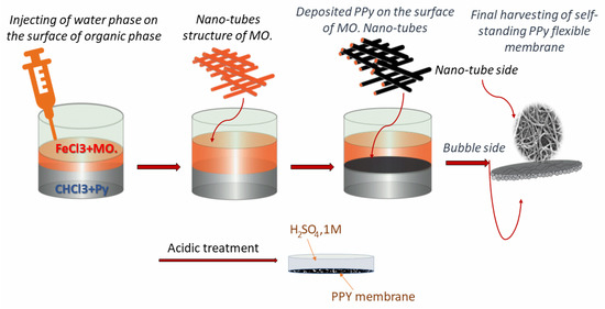 Acid treatment (AT) was performed by immersing the as-synthesized PPy–MO membranes in a solution of 1M sulfuric acid for 2 h. For the PPy membrane, this step was performed after the washing process. The main steps of membrane preparation are showed in Figure 1. The acid treated PPy and PPy–MO membranes were named PPy–AT and PPy–MO–AT, respectively.