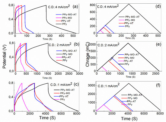 Figure 3 shows the GCD curves of different PPy membranes that were tested under current densities of 1, 2, and 4 mA/cm2 between a potential range of 0.0–0.8 V. It is obvious in Figure 3a–c that discharging time is significantly increased for the PPY–MO–AT, and the charge curves (Figure 3d–f) confirm that the charge stored in the PPY–MO–AT is indeed much higher than that in other three membranes. Among other membranes, the PPY–AT and PPY–MO show a longer discharging time and higher stored charge comparing to the PPY membrane. All curves show a good reversibility.
