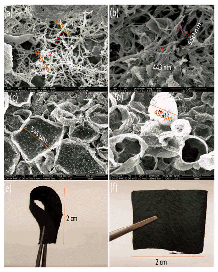 Scanning electron photomicrographs of the PPy (a,c) and PPy–MO (b,d) membranes at different magnifications (a,b: 5000×, c,d: 100×). The fibrous structures appear on the water-facing surface of the membranes (a,b) and the bubble-like structures appear on the chloroform-facing surface of the membranes (c,d). (e,f): The optical photographs demonstrating the appearance and flexibility of the PPy–MO membrane. Red arrows: PPy fibers. Green arrows: crystals of FeCl3/FeCl2.