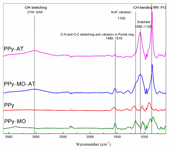 The FTIR spectra of the membranes are presented in Figure 6. The characteristic bands of PPy show the C-H bending at 880–912 cm−1 [20], the C-C and C-N stretching and vibration mode of the pyrrole ring at 1480–1510 cm−1 and a broad peak at about 2700–3200 cm−1, indicating the presence of OH bonds in carboxylic acid [20,21,22]. The other peaks corresponding to sulfuric acid, MO, and ferric chloride are also indicated in the FTIR spectra [22].