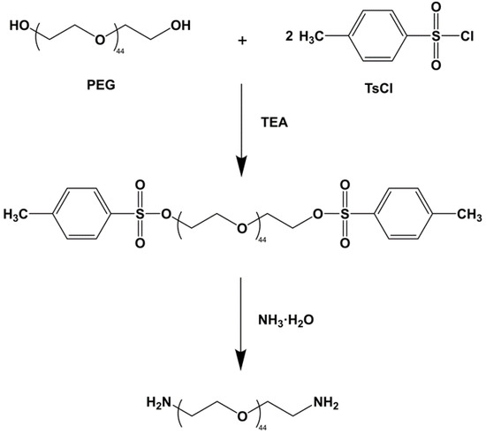 TsO-PEG-OTs and ammonia water were added to a 150 mL autoclave and sealed at 140 °C for 6 h, then cooled to room temperature, and the aqueous phase was extracted with dichloromethane; sodium hydroxide aqueous solution (1M) was added, and the mixture was left standing after stirring for 4 h. The organic phases were combined, washed with deionized water to pH = 7, and freeze-dried to obtain a white powder product (H2N-PEG-NH2). The reaction process is shown in Figure 1.