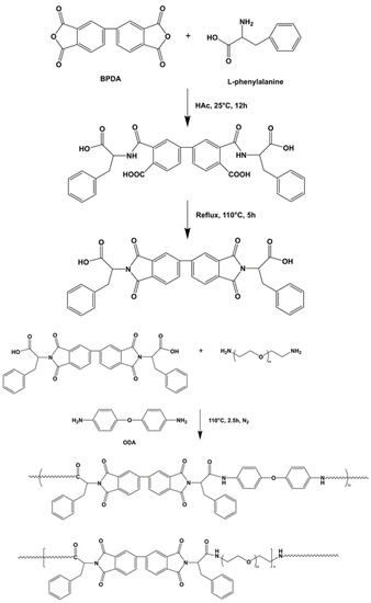 Poly(amide-imide) (PAI) was chosen in our work because it has been widely used in the industrial field as an engineering plastic due to its excellent mechanical properties and extremely high thermal stability. However, its lack of biodegradability limits its application in the field of biomaterials. Previous studies have introduced L-amino acids into non-degradable polymers [7,8,9] to make the non-degradable materials biodegradable. The reason is that amino acids can endow the polymer materials with bioactive sites similar to peptide materials, and also provide enzymatic hydrolysis sites for the biodegradation of polymers [10,11,12]. In our previous research [13], the synthesized PAI derived from L-phenylalanine showed good biocompatibility, biodegradability, and potential application value in the field of biological materials. However, the hydrophilicity of PAI is poor. Therefore, we hope to improve the hydrophilicity of PAI by introducing the hydrophilic polyether segment to form copolymers with PAI.