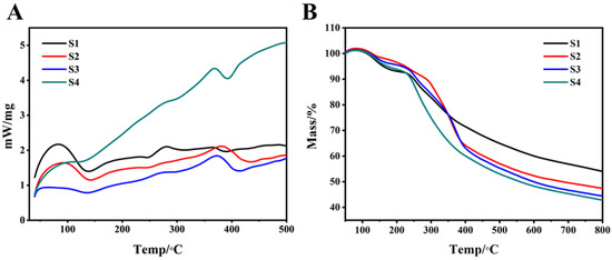 S1–S4 comprehensive thermal analysis spectrum. (A): S1–S4 DSC curve; (B): S1–S4 Tg curve.