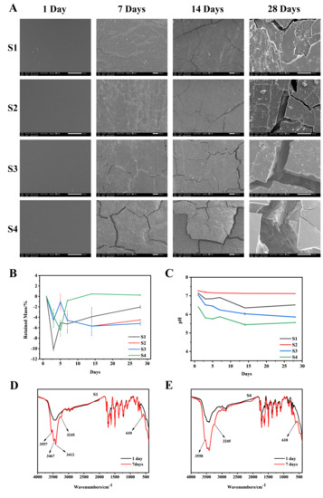 In vitro degradation experiment. (A): SEM surface morphology of S1–S4 degraded in PBS at 37 °C for 1, 7, 14, and 28 days. (B): residual mass during S1–S4 degradation; (C): during S1–S4 degradation pH value of degradation solution; (D): Infrared characterization chart of S1 without degradation and degradation for 7 days; (E): Infrared characterization chart of S4 without degradation and degradation for 7 days.