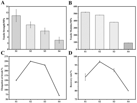 Analysis of mechanical properties of S1–S2; (A) Elastic strength; (B) Elastic modulus; (C) Elongation at break; (D) Recovery rate.