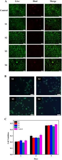 (A): Live/dead staining of the BMSCs that were cultured for 5 days on the S1–S4, respectively. (B): CLSM micrographs of the BMSCs adhesive on S1–S4 for 3 days. (C): Cell viabilities of the BMSCs that were cultured on the S1–S4 for 1, 3, and 5 days, respectively.
