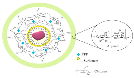 Hypothetical representation of the structure of cardanol-loaded CHI-TPP-ALG NPs.
