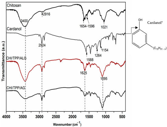 Figure 3 shows the spectra of cardanol, chitosan and encapsulated nanoparticles. In the CHI spectrum, the prominent bands present in the structure of this polymer were evidenced: 3400 cm−1 referring to OH/NH stretching, 1580 cm−1 [30,31] assigned to NH vibrations, 2916 cm−1 referring to the vibrations of C─H bonds, 1654 cm−1 assigned to the carbonyl absorption of -NC=O groups of amide II, 1151 cm−1 and 1021 cm−1 of CO bonds [14]. The spectrum of cardanol showed the following vibrations: OH phenolic stretching (3400 cm−1), CH extretching of the aromatic and chain double bonds (3009 cm−1), methyl, methylene, and methyl groups (2916 cm−1), C=C in the aromatic ring (1609, 1588 and 1505 cm−1), symmetric and asymmetric C=C bending (1264 cm−1, 1149 cm−1), and vibrations of the four hydrogen atoms adjacent to the benzene ring (778 cm−1, 691 cm−1) [32,33,34]. In the spectrum of sodium alginate, absorption peaks were observed around 2900 cm−1 and 1415 cm−1, due to the -CH2 stretching. A broadband was observed near 3400 cm−1, resulting from the axial deformation of OH. It was observed that the deformation of the -COO- ion gives rise to two bands—one at 1415 cm−1 and another of higher intensity at 1610 cm−1, resulting from symmetric and asymmetric axial deformations, respectively [35,36,37]. It was also possible to observe a band at 1034 cm−1, due to symmetric C-O-C axial deformation [35,36,37]. All NPs showed bands at 3400 cm−1 referring to OH deformation, and 2924–2927 cm−1 and 2852–2854 cm−1 attributed to symmetric and asymmetric deformations of the CH2/CH3 groups present in the cardanol structure [28,29,30,31,32]. In a previous study carried out by the group [28], the increase in the intensity of the band at 3400 cm−1 and 1625 cm−1, is significantly higher than that of the matrix, suggesting the existence formation of hydrogen bonds between the biopolymers involved in the encapsulated nanoparticles [38,39].