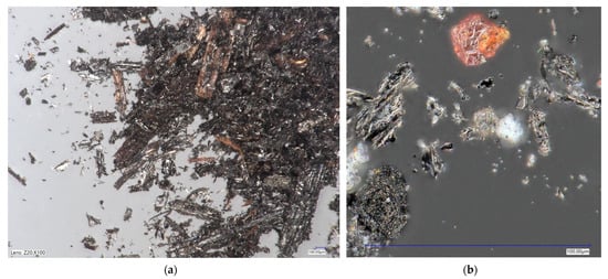 Optical microscope view of biochar: (a) overall picture; (b) shape of the single grain.