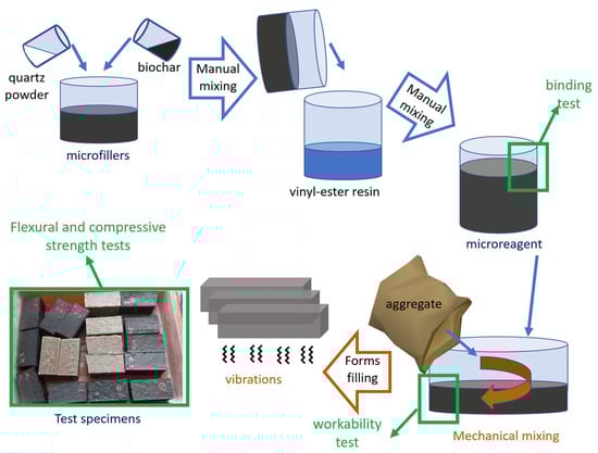 Sample preparation took place in a three-stage process. In the first step, the microfiller mixture was prepared, followed by the addition of microfiller mixture to the resin, and then final mechanical mixing with quartz sand. The mixture was then placed in two layers in the molds and vibrated for 5 s until the mold was tightly filled (Figure 3).