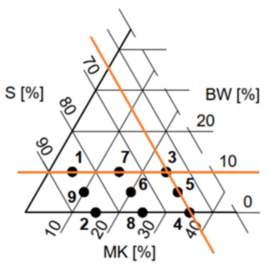 In order to determine the effect of biochar on polymer composites, an experimental plan was prepared, based on the standards for ternary mixtures. The dosage of sand was applied as a constant. The experimental plan was intended for the component proportions in the micro slurry. Therefore, the amount of resin (S), biochar (BW), and quartz powder (MK) were applied as input variables. In preliminary studies, the maximum and minimum dosages of the individual components were determined, so that the mixture could be workable and samples could be formed. Consequently, the experimental plan had limitations (Figure 4, Table 2). In the experimental plan, the volumetric variation in the dosage of components was assumed.