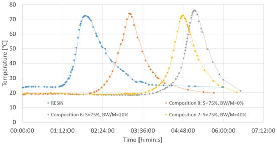 Testing the course of setting began shortly after mixing the ingredients, and it was performed on a 200 mL sample. The shortest curing time was observed for the resin itself (less than 2 h). The enrichment of the mixture with microfiller resulted in a longer setting process. The composite consisting of 75% resin and 25% quartz powder (without biochar) had the shortest workability time, gelation time and hardening time (Figure 5). The setting process started 1 h later than in the case of pure resin composite. The curing time curves for the two compositions in which the quartz powder was partially replaced by biocarbon were the longest—the curing time was about 5 h in both cases. The highest temperature (and the longest curing time at the same time) was observed for the composition no. 6, in which the BW/M ratio was 0.2 (Table 3).