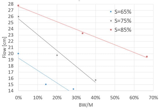 Flow of a fresh composite as a measure of workability as a function of the level of biochar content and the level of polymer content.