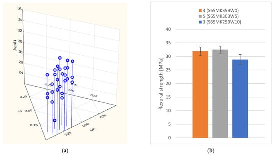 A dosage of biochar up to 5% (S65MK30BW5) does not result in a significant reduction in flexural strength. A 10% biochar dosage (S65MK25BW10) is likely to have lower flexural strengths than non-biochar modified composites due to poorer workability and thus more difficult compaction of the fresh composite (Figure 7b). However, despite the lower average flexural strength value, it should be noted that the differences between the compositions with different levels of biochar dosage: S65MK35BW0, S65MK30BW5 and S65MK25BW10 are within the standard deviations of the results for one composition.