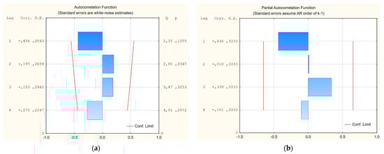 The regression equation describing the dependence of strength on composition was obtained from the compressive strength results (Equation (1)). The coefficient of determination (R2 = 0.80 and MAPE = 1.58%) was calculated. The partial autocorrelation function and autocorrelation function of the residual number of the equation of compressive strength were analyzed (Figure 8):