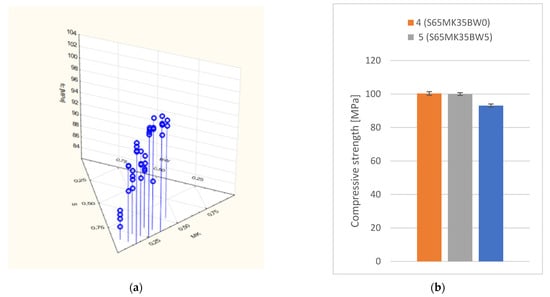 The resulting model indicates that the introduction of biochar into the polymer matrix yields a slight reduction in compressive strength. This effect is less pronounced when biochar replaces part of the polymer (a decrease of 5–7%) than when it replaces part of the quartz filler (a decrease of 10–15%). A dosage of biochar up to 5% (S65MK30BW5) does not result in a significant reduction in compressive strength. A 10% biochar dosage (S65MK25BW10) is likely to have lower compressive strength than non-biochar modified composites, due to poorer workability and thus more difficult compaction of the fresh composite (Figure 9b).