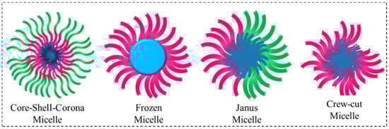 - Erhardt, R.; Bo1ker, A.; Zettl, H.; Kaya, H.; Pyckhout-Hintzen, W.; Krausch, G.; Abetz, V.; Muller, A. Janus Micelles. Macromolecules 2001, 34, 1069–1075. [Google Scholar] [CrossRef]