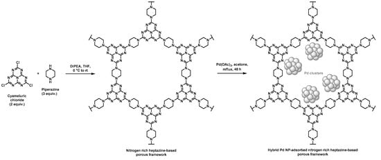 Synthetic pathway for the preparation of hybrid materials based on nitrogen rich heptazine-derived porous polymers and Pd NPs [42,43].