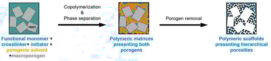 A large variety of synthetic pathways can lead to porous polymeric materials [24]. Single-piece porous polymers, the so-called monoliths, are generally prepared from a functional monomer, a cross-linking agent, and a porogenic agent, e.g., an organic solvent. A large variety of such monoliths can be prepared depending on the nature of the functional monomer and of the cross-linker. Moreover, the pore size of those materials can be finely tuned by playing with the nature of the porogenic agent [29]. Among other porogenic agents to generate pores can be found solid particles [30,31] and linear polymers [32,33]. Alternatively, emulsion templating [34,35] and sometimes a combination of some of the above-mentioned porogens can be implemented, leading to at least two porosity levels [36,37,38,39].