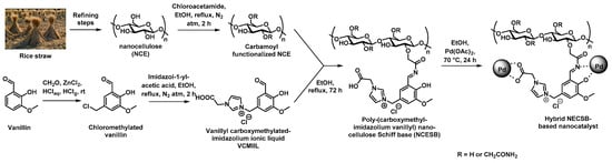 Recent studies from Yahya et al. reported on the implementation of a green and sustainable polymeric support prepared by refining rice straw to ionic nanocellulose Schiff base (NCESB). To this purpose, refining of the straw was processed by successive dewaxing, swelling, de-pulping, bleaching, and acidic hydrolysis steps, as shown in Figure 6 [52]. The as-obtained nanocellulose (NCE) was then treated by carbamoylmethylation to afford the resulting carbamate functionalized NCE that was modified with a vanillin derivative presenting an imidazolium ionic liquid motif to give the corresponding Schiff base-containing nanocellulose. In a final synthetic step, the hybrid material was prepared by immersion of the NCESB with a palladium acetate salt solution that allowed for the bio-reduction of the latter. TEM was used to verify the presence of well-dispersed Pd NPS presenting rather narrow pore-size distribution (5–23 nm) in the porosity of the polymer support. This green hybrid NCESB-Pd nanocatalyst was assessed regarding the Suzuki reaction using a wide range of halobenzenes and phenylboronic acid. This new catalyst exhibited amazing activity in such coupling reactions at 50 °C in short reaction times (15–60 min) and even at room temperature for longer reaction times of ca. 120 min. Finally, the recyclability of the catalyst was confirmed by monitoring the activity of the NCESB-Pd nanocatalyst on the Suzuki coupling reaction after five consecutive runs (Table 1). No significant loss of catalytic activity was observed after five cycles as 88% yield of the desired product was obtained. Different characterization techniques were used to demonstrate that the nanocatalyst was not altered in its structural and morphological nature (FTIR, XRD) while ICP-AES showed that no significant leaching (<1%) of Pd NPs was observed after these five runs, thus demonstrating the robust anchoring of the Pd NPs at the pore surface of the NCESB through carboxy, azomethine, hydroxy, and methoxy groups. The authors claimed that the new ionic nanocatalyst may pave the way for a novel generation of ionic low-cost green and highly effective nanocatalysts for organic transformation reactions.