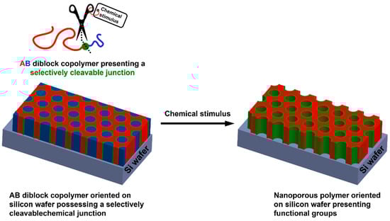 Oriented nanoporous polymer-based thin films can also be used as interesting supports for the adsorption of metallic NPs. Thus, pore sizes of nanoporous materials are appealing for catalysis applications, as they can provide a filtration phenomenon occurring simultaneously to the catalytic activity. Such materials can be obtained from well-defined di- but also triblock copolymers containing immiscible homopolymer segments. Indeed, depending on three different parameters, i.e., the Flory–Huggins interaction parameter between both blocks (χAB), N the number of repetition units, and f the volume fraction of the minority block; such AB diblock copolymers can adopt different morphologies after macroscopic orientation, including body-centered spheres, hexagonal cylinders, bicontinuous gyroids, and alternating lamellae. For instance, nanoporous polystyrene could be obtained from polystyrene-block-poly(d,l-lactic acid) (PS-b-PLA) [77,78], polystyrene-block-poly(ethylene oxide) (PS-b-PEO) [79], or polystyrene-block-poly(methyl methacrylate) (PS-b-PMMA) [80], for instance. Removing the sacrificial block could be achieved by selective chemical degradation of the minority block, but this generally required harsh experimental conditions, e.g., alkaline or acidic media, strong UV irradiation, etc. Another alternative and somehow smarter path for removing the sacrificial block lies in the selective cleavage of a chemical moiety conveniently positioned at the junction between both blocks, as depicted in Figure 7. This notably allows for using milder and more environmental-friendly experimental conditions but also positioning at the pore surface chemical functionalities of interest so as to envision further post-polymerization modification. Thus, different studies based on this synthetic strategy have emerged in the literature. Some of them notably mentioned the possibility to use photocleavable anthracene dimer-, acetal- [81], boronate [82], disulfide-, or ortho-nitro ester-based chemical junctions between the remaining and the sacrificial block [83]. This was reported by Ryu et al., who prepared oriented thiol-functionalized nanoporous thin films from a disulfide containing diblock copolymer so as to generate gold cylinders after Au NP adsorption at the pore surface [84]. Unfortunately, no application was described in this work.