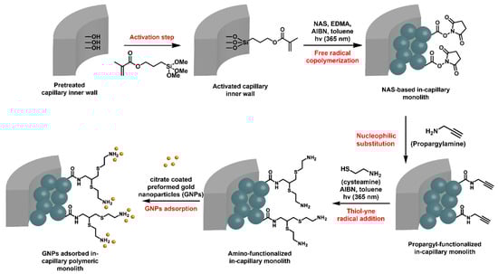 N-acryloxysuccinimide (NAS)-based monoliths were deeply investigated in-capillary as porous microsystems of choice for the adsorption of Au NPs and the further supported heterogeneous catalysis of flow-through molecular reactions [56]. The preparation of such monoliths relied again on the use of a porogenic solvent that is removed after polymerization, allowing for the generation of the pores, i.e., toluene in this particular case. The available NHS-activated ester functional group is well-known to react with nucleophiles, such as amines, for instance. In this work, the activated esters were reacted with propargylamine, as shown in Figure 8. A second UV-triggered thiol-yne radical addition with cysteamine allowed for decoration of the pore surface with amine functions. Such a functionalization step could be easily monitored by Raman spectroscopy that allowed for highlighting the disappearance of different characteristic signals of the NHS activated ester group, such as those from imide symmetric and asymmetric stretching at 1785 and 1730 cm−1, respectively, and from activated ester stretching at 1812 cm−1. In parallel, the characteristic signal from terminal alkyne was observed at about 2100 cm−1. The second step notably permitted spatial control of the grafting, as only the irradiated monolith was functionalized. In this way, micropatterning was possible by using photomasks. Amine functions were prone to adsorb Au NPs. A suspension of commercially available citrate stabilized Au NPs was percolated through the NAS-based amine-functionalized monolith. This example, that did not evidence flow-through catalysis, emphasized the photo-triggered strategy implemented in this study.