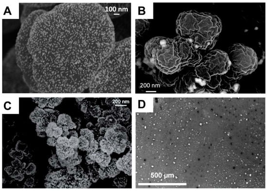 Other research groups mentioned the use of membranes presenting embedded NPs. Mora-Tamez et al. [66] reported on the implementation of Au NPs immobilized cellulose triacetate-based membranes. To this purpose, membranes composed of cellulose triacetate were prepared in the presence of some plasticizers (i.e., 2-nitrophenyl octyl ether and Adogen® 364) and semi-interpenetrated with an inorganic phase prepared by sol-gel process in the presence of poly(dimethylsiloxane) and tetraethoxysilane. The authors claimed that the originality of the synthetic strategy arose from the extraction of Au3+ ions by the membranes through percolation for 5 h and their concomitant in situ reduction with a 0.01 M sodium citrate solution (Turkevitch method). The resulting hybrid membranes were characterized using SEM imaging that demonstrated the presence of Au NPs within the membranes (Figure 9D) but also by nitrogen adsorption/desorption isotherms (BET method). Specific surface area values ranging from 67 to 137 m2·g−1 and pore volume values from 0.048 to 0.097 mL·g−1 were obtained. Other characterizations, such as transport properties, cyclic voltammetry, and XPS, were performed to determine the gold quantity within the materials. The reduction of p-nitrophenol was successfully achieved through such membranes. Two types of hybrid membranes were compared in this study, one prepared from polymeric inclusion membranes (PIMs), also called AuNPs-PIM, and the other one obtained from starting polymeric nanoporous membranes (PNMs), also called AuNPs-PNM10%. The first one contains no additional porogen while the second one contains 10 wt % dimethyl phtalate as a nanoporogenic agent. The obtained results suggested a better catalytic efficiency of the AuNPs-PIM membranes, with ~95% reduction in 25 min. On the other hand, the AuNPs-PNM10% membranes reduced only ~87% of the reactant after 120 min.