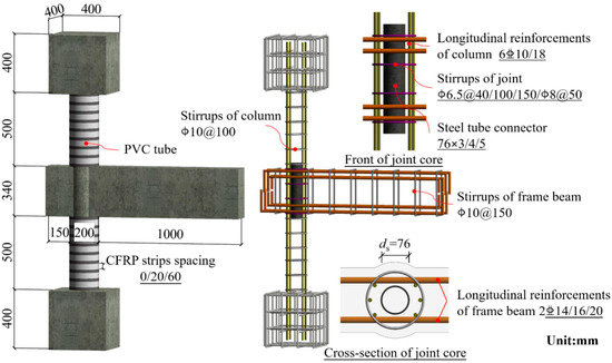 To ensure that the loading conditions of the specimens were in accordance with the stress characteristics of the frame joints, a T-shaped joint consisting of the upper and lower columns and a unilateral frame beam were intercepted as the investigation objects. The overall appearance and detailed reinforcements of the specimens are plotted in Figure 1.