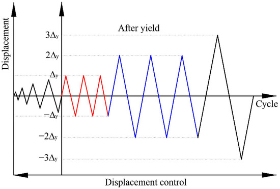 Referring to the test method specified in China Industry Standard JGJ/T 101-2015 [43], the displacement control is adopted, as illustrated in Figure 3. The loading process can be divided into two stages: Before the specimen yield, the load cycles for each control level performs once, and the displacement amplitude increases by 1 mm after each cycle. Then, the load for each control level repeats thrice with an integral multiple yield displacement Δy as the displacement amplitude until the specimen is destroyed or the load declines to 85% of the peak bearing capacity. However, considering the relatively poor deformability in the joint core of the designed specimens, the method of identifying the yield displacement Δy by the reinforcements yielding may result in the premature failure of the specimens. Consequently, in accordance with the crack development and reinforcements strain of the specimens in the pre-test, 6 mm is selected as the yield displacement in subsequent test. Nevertheless, regarding the subsequent seismic performance analysis, the veritable yield displacement is determined by the energy equivalence method [44] based on the obtained load-displacement skeleton curves.