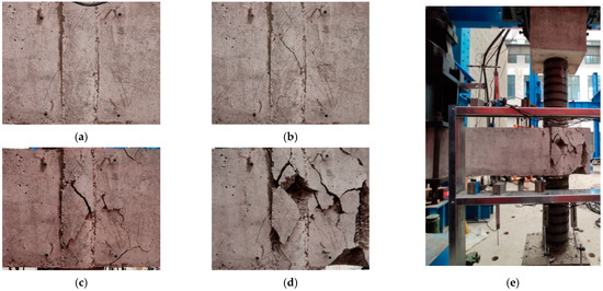 Typical crack and failure mode. (a) Oblique cracks. (b) Crossed oblique cracks. (c) Cracks extending. (d) Concrete spalling. (e) Overall failure mode.