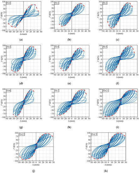 Hysteresis and skeleton curves of the specimens. (a) PJ-0. (b) PJ-1. (c) PJ-2. (d) PJ-3. (e) PJ-4. (f) PJ-5. (g) PJ-6. (h) PJ-7. (i) PJ-C1. (j) PJ-C2. (k) PJ-C3.