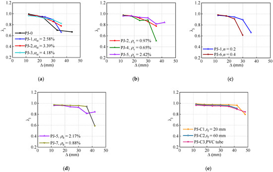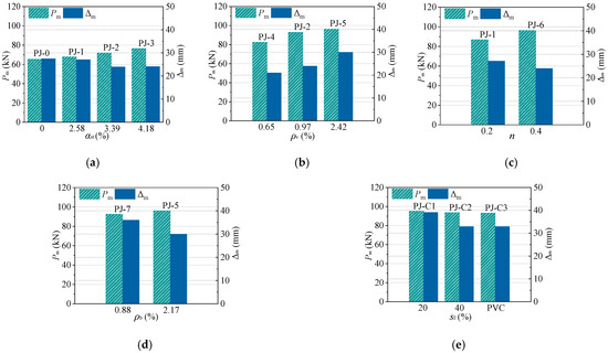 On the basis of the validated FE model, additional parameters which may influence the seismic behavior of the joints are further analyzed, for the purposes of improving the seismic design of this composite structure. The P-Δ skeleton curves with the various parameters are illustrated in Figure 17. The specimen designs for parameter analysis are the same as that of the specimen PJ-2 unless otherwise stated.
