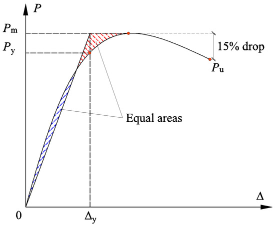 The ductility coefficient is a crucial indicator to quantify the deformability of the RC structures in seismic design, which is defined as the ratio of the ultimate displacement to the yield displacement . Based on the skeleton curves established above, is defined as the point corresponding to a 15% strength degradation from the peak point. is determined by the energy equivalence method [44], as illustrated in Figure 8. The ductility coefficients of each specimen are summarized in Figure 9.