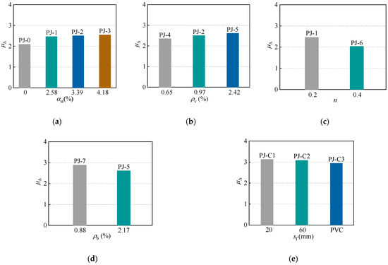 Effects of design parameters on the ductility coefficients. (a) Steel ratio of STC. (b) Stirrup ratio of the joint. (c) Axial compression ratio. (d) Reinforcement ratio of the frame beam. (e) CFRP strips spacing.