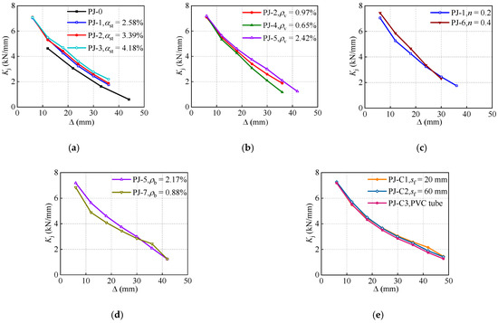As shown in Figure 11, a similar law to the strength degradation is revealed in the stiffness degradation, presenting two distinct rates of degradation. After the turning point, the specimens PJ-3 and PJ-5 with a higher steel ratio of STC and stirrup ratio of the joint present a more stable stiffness degradation than that of the specimens PJ-0, PJ-1, PJ-2 and PJ-4. This behavior further demonstrates the effectiveness of the STC and joint stirrups in enhancing the seismic performance of the proposed joint. In contrast with the strength degradation, the specimen PJ-1 exhibits a slightly lower initial stiffness compared with the specimen PJ-6. However, as the loading proceeds, the specimen PJ-6 presents a more severe tendency of stiffness degradation due to the accelerated cracks development with the axial compression ratio increases.