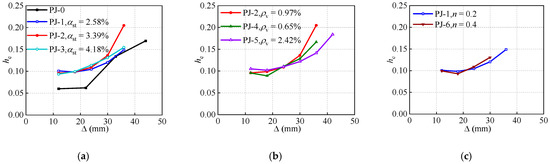 In addition, the impact of the stirrup ratio of the joint on the is revealed in the ascending stage, i.e., the increases with the improvement in the stirrup ratio of the joint. Interestingly, the of the specimen PJ-5 is smaller than that of the specimens PJ-2 and PJ-4 after the displacement reaches 36 mm. This is due to the fact that the confining effect from the joint stirrups of the specimen PJ-5 is not entirely developed. On the other hand, the specimen PJ-5 exhibits a more favorable capability of cumulative energy dissipation. As the axial compression ratio increases, the curves present a faster growth rate. This is mainly because, the lateral deformation of the joint concrete expands correspondingly with the increasing axial compression ratio. However, it also induces the earlier damage of the specimens. As expected, the CFRP strips spacing exhibits a slight impact on the stiffness degradation, nevertheless, as described in the Ref. [51], the efficacy of the CFRP strips in the joints with STC can probably be found in the high axial compression ratio specimens. In addition, the specimen PJ-5 presents a relatively excellent energy dissipation capacity, especially in the ascending stage, where its is 20.9% to 38.5% higher than that of the specimen PJ-7, which may attribute to the increased flexural stiffness of the frame beam.