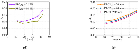 The development of the curves is presented in Figure 13. In combination with the skeleton curves, the curves are classified into the stable stage and ascending stage. It can be observed that the of the joints with STC are higher than that of the ordinary joint throughout the loading process. However, owing to the bond failure between the joint concrete and STC, the STC does not yield completely, resulting in the effect of the steel ratio of STC on the is not noticeable.