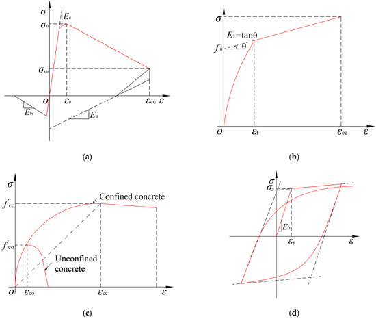 The ‘Concrete02′ and ‘Concrete03′ models are commonly adopted in OpenSees to simulate the concrete under seismic action since they can incorporate the stiffness degradation and hysteretic energy dissipation of the concrete during the loading and unloading. Nevertheless, in view of the time consumption of the concrete03 model, model concrete02 is introduced in the analysis models of the sandwiched concrete and ordinary concrete. The stress–strain relationship of the proposed model is illustrated in Figure 14a.