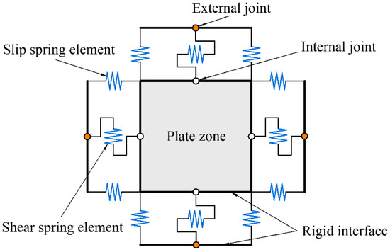 The joint core area is modelled with fiber cross sections, as presented in Figure 15. The beam-column element model is composed of four internal joints and four external joints, and all internal and external joints are located at a rigid interface. Each external joint has one degree of freedom for rotation and two degrees of freedom for translation to ensure the compatibility of the frame beam and column elements. Between the two rigid interfaces, eight zero-length slip spring elements are developed to consider the degradation of the stiffness and strength owing to the bond slip between the longitudinal reinforcements and concrete. The degradation of the shear force transmission capacity at the interface around the joints is simulated by four zero-length shear spring elements. Additionally, the degradation of strength and stiffness caused by the joint shear failure is simulated by the plate zone.