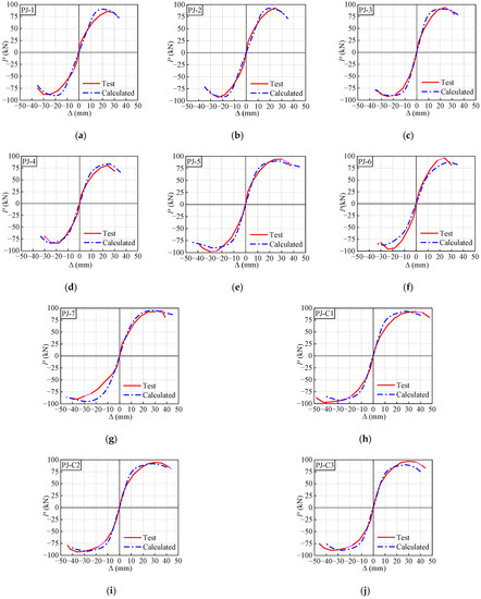 Comparison between the test and calculated skeleton curves. (a) PJ-1. (b) PJ-2. (c) PJ-3. (d) PJ-4. (e) PJ-5. (f) PJ-6. (g) PJ-7. (h) PJ-C1. (i) PJ-C2. (j) PJ-C3.