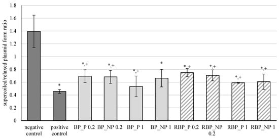 The results of the effects of banana and red beetroot peel extracts, with (BP_P and RBP_P, respectively) and without (BP_NP and RBP_NP, respectively) polysaccharides, on oxidative damage of the DNA model caused by hydroxyl radicals are shown in Figure 1. The results are expressed as the ratio between supercoiled and relaxed plasmid forms.