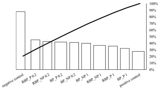 Pareto chart showing the trend of the protective effect of banana and red beetroot peel extract against hydroxyl radicals generated with UV and hydrogen peroxide on a DNA model. BP_P-banana peel extract with polysaccharides; BP_NP-banana peel extract without polysaccharides; RBP_P-red beetroot peel extract with polysaccharides; RBP NP-red beetroot peel extract without polysaccharides, concentrations 0.2 and 1 mg mL−1.