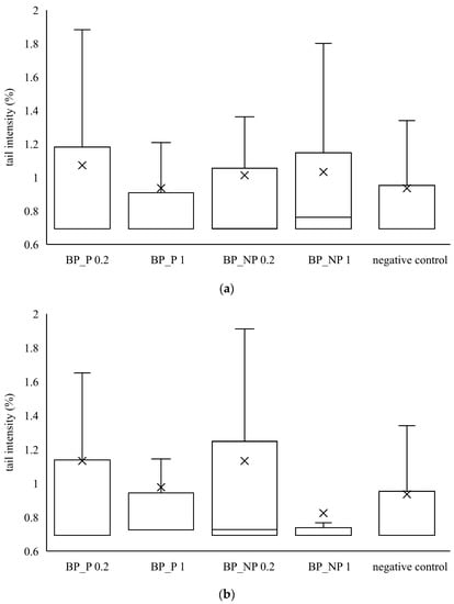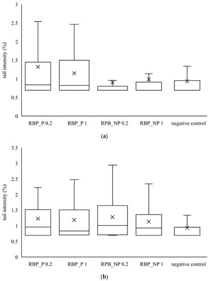 Genotoxic effect of red beetroot peel extract on (a) CaCo2 cells and (b) HepG2 cells. A box and whisker plot summary of a set of tail intensity data obtained in 100 comets. X represents the mean value of tail intensity, the bottom line is the minimum, the middle line represents the median value of tail intensity, and the area above the median line is the third quartile of the tail intensity data. The upper whisker is the maximum value measured by the comet assay. RBP_P-red beetroot peel extract with polysaccharides; RBP_NP-red beetroot peel extract without polysaccharides, concentrations 0.2 and 1 mg mL−1.
