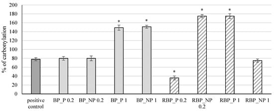 Effect of banana and red beetroot peel extracts on protein carbonylation. Results are presented as the mean value +/− standard deviation of 3 independent experiments. BP_P-banana peel extract with polysaccharides; BP_NP-banana peel extract without polysaccharides; RBP_P-red beetroot peel extract with polysaccharides; RBP_NP-red beetroot peel extract without polysaccharides, concentrations 0.2 and 1 mg mL−1; *—statistically significant (p < 0.05) difference in comparison to positive control.
