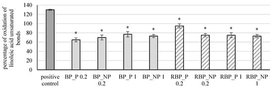 Effect of banana and red beetroot peel extracts on damage of linoleic acid. Results are presented as the mean value +/− standard deviation of 3 independent experiments. BP_P-banana peel extract with polysaccharides; BP_NP-banana peel extract without polysaccharides; RBP_P-red beetroot peel extract with polysaccharides; RBP NP-red beetroot peel extract without polysaccharides, concentrations 0.2 and 1 mg mL−1; *—statistically significant (p < 0.05) difference in comparison to positive control.