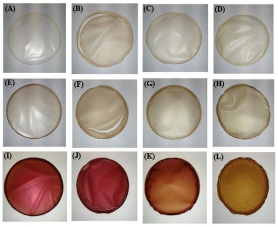 Visual appearance of formulated edible films: (A): C_A, (B): C_RIC, (C): C_PEA, (D): C_PUM, (E): BP_A, (F): BP_RIC, (G): BP_PEA, (H): BP_PUM, (I): RBP_A, (J): RBP_RIC, (K): RBP_PEA, (L): RBP_PUM.