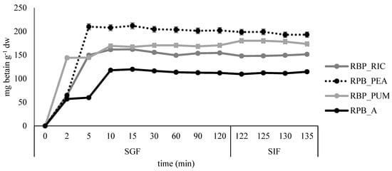 The fastest release of betacyanins was observed in sample RPB_PUM, where most of the betacyanins were released after 2 minutes in SGF, while in samples RBP_RIC and RPB_PEA, the release was prolonged to 5 minutes in SGF, and additionally to 10 min in the control sample RPB_A. After the highest release was reached, little or no additional release was observed during the remaining time in SGF and SIF. Similar results were reported by López de Lacey et al. [40], who noted a more rapid release of tea polyphenols from agar films at the beginning of digestion and a tendency to decrease significantly during gastric digestion, whereas little or no release was observed during intestinal digestion.