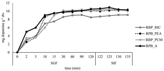The slowest release of dopamine was observed in sample RPB_PUM where most of the dopamine was released after 15 min in SGF, while in all remaining samples the fastest dopamine release was observed during the first 10 min in SGF. The slight increase in dopamine release was continued during the remaining time in SGF and SIF for samples BP_A, BP_PEA, and BP_PUM, whereas for the sample BP_RIC distortion in release kinetics was observed at the end of SGF, but release increased slightly again during the time in SIF.