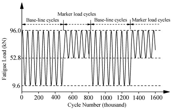 Specimens with five kinds of corrosion damage levels and four kinds of strengthening configurations were fabricated to investigate the effect of corrosion degrees and strengthening schemes on the fatigue behavior of corroded steel plates strengthened with CFRP plates. Table 2 presented a summary of specimens’ parameters, where Case A was bare steel plate without any patch, Case B was the steel plate double-side patched without anchorage, Case C was the steel plate single-side patched with anchorage and Case D was the steel plate double-side patched with anchorage. Figure 1a,b present the dimension and strengthening configuration, and the manufacturing process of the corroded steel plate that was double-sided patched with anchorage, respectively. Fatigue tests were performed on the MTS-322 electrohydraulic servo fatigue testing machine with a maximum cyclic load of ±250 kN. Specimens were tested under constant amplitude sinusoidal cyclic load with a frequency of 13 Hz, and the well-known beach-marking technique was adopted to mark the crack initiation and propagation process. Figure 2 presented the fatigue loading cycles adopted in the “beach marking” technique. As shown in Figure 2, the maximum fatigue load (Pmax) of all the strengthened specimens was 96 kN, and the load ratios (Pmin/Pmax) of baseline cycles and marker load cycles were 0.1 and 0.5, respectively. More details can be found in [,].